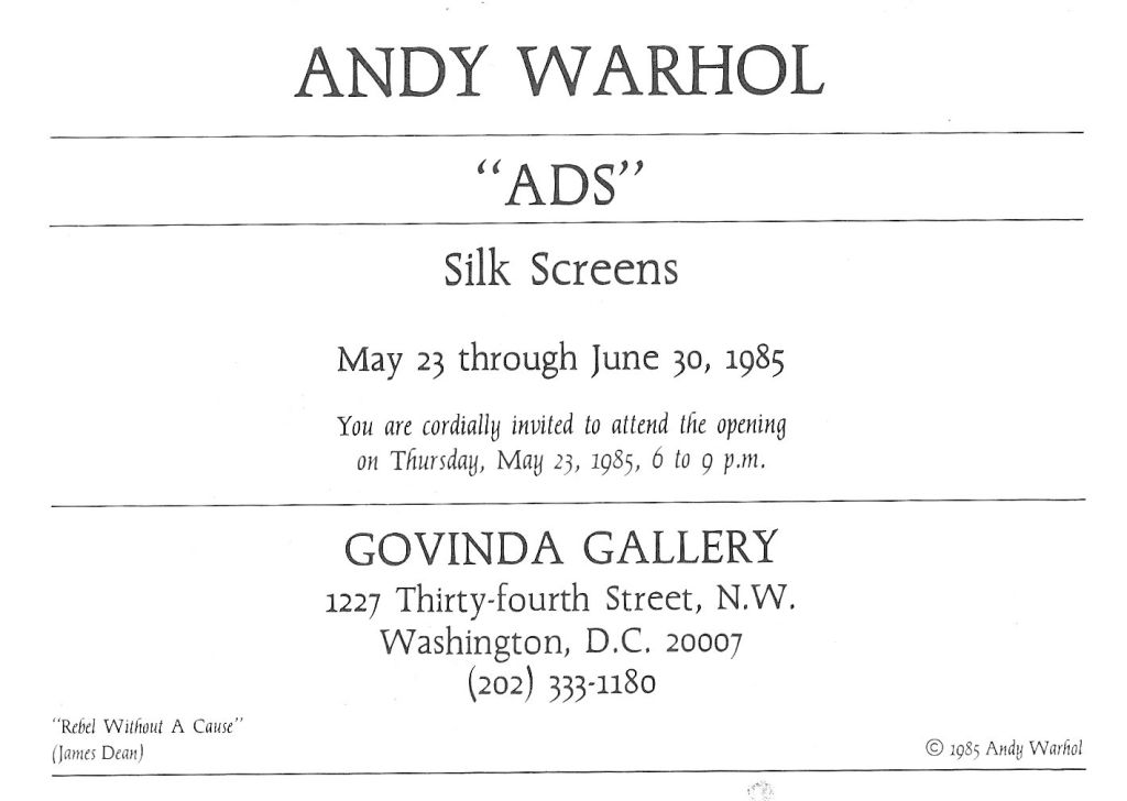 The Govinda Gallery invitation to Andy Warhol’s “Ads” exhibition, May 23 through June 30, 1985: