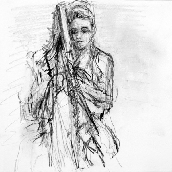 “Rendered quickly during last summer’s All Ireland Music Festival, the pencil drawings in “The Pure Drop” depict hands, instruments and the very motions of playing music. The title of Carlotta Hester’s Govinda Gallery show refers to the integrity of traditional Irish music, played on guitars, fiddles, accordions, flutes and – by one impure participant – a Roland synthesizer. But it also alludes to the rigor of the local artist’s approach: She sketched only in the instant, with no subsequent touch ups, and always from life, without any photographic assistance.
