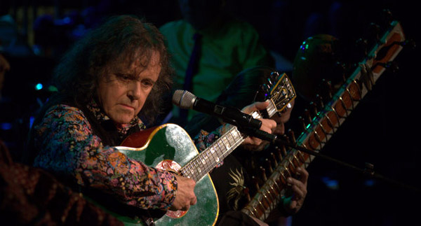 Donovan in concert playing Kelly, his custom made Danny Ferrington guitar with Shawn Phillips on Sitar. Copyright © Virgilio Fino. All Rights Reserved.