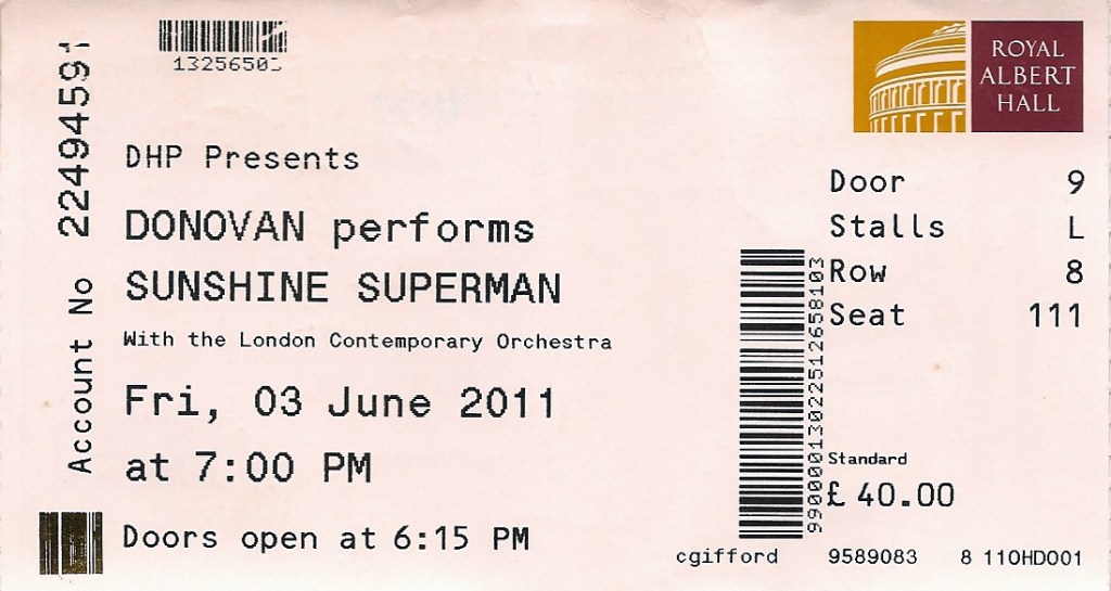 London was abuzz with Donovan’s concert at The Royal Albert Hall Friday evening, June 3rd. Donovan was performing in concert Sunshine Superman note for note for the first time since its original release when it went to number one in 1966. There were two days of rehearsals at the Music Bank studios in London before the final rehearsal and concert at The Royal Albert Hall.