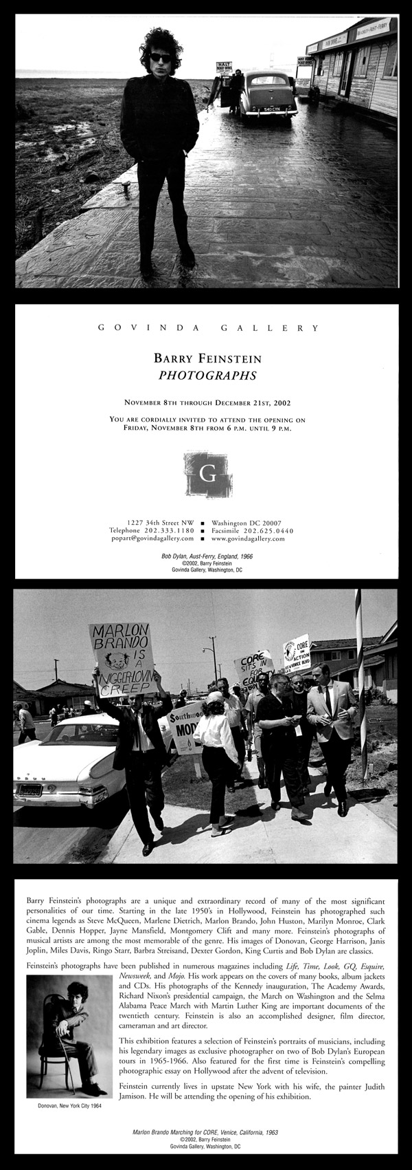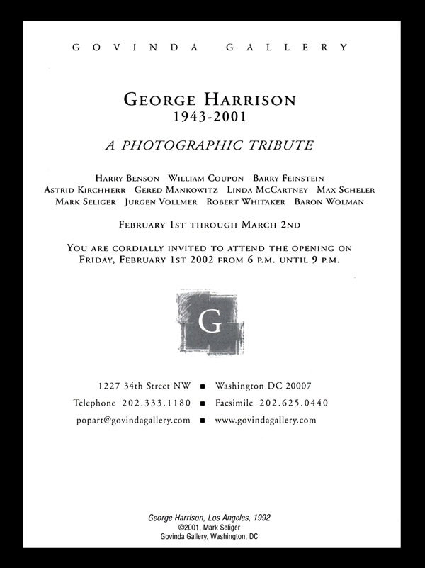 Govinda Gallery is proud to have hosted Barry Feinstein’s first exhibition, simply titled Barry Feinstein: Photographs in 2002. His extraordinary images of Bob Dylan, Janis Joplin, George Harrison and King Curtis are known throughout the world. Barry’s dear friend Donovan came to his opening reception at Govinda Gallery and played several songs in honor of Barry. Photographers Jim Marshall and Danny Clinch attended that opening as well. The Washington Post art critic, Jessica Dawson, wrote of “Barry Feinstein’s iconic toilet graffiti photographs”, that were featured in the Rolling Stones 40×20 exhibition at Govinda in October of 2002. Those photographs were used for the front and back covers of the Rolling Stones album Beggars Banquet. Barry’s photographs of George Harrison were also featured in our tribute exhibition to George in 2002. Barry was always generous, creative, and a loyal friend. We love you Barry.