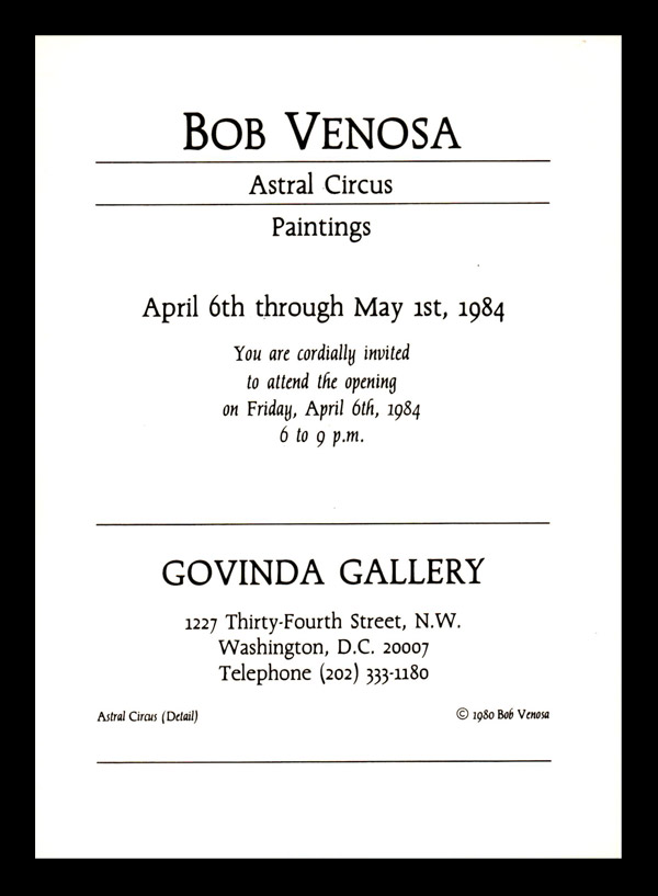 Bob Venosa was one of the great visionary artists it was our pleasure to show at Govinda Gallery. I first met Bob in Cadaques, Spain, where I was living during the summer of 1972 with artists Howard Carr and Kim Waters. Bob came to Cadaques to meet Salvador Dali. We knew Dali and were performing as a musical trio every evening at Dali’s home in Port Lligat, while he entertained guests by his swimming pool in his surreal garden. We brought Bob to Dali’s home and introduced him to the great master painter, and we remained friends ever since. Bob’s paintings were featured in several exhibitions at Govinda including two one-person shows in 1984 and 1980. We reproduce here the invitations from those two exhibitions along with a photograph of Bob Venosa showing Albert Hoffman his portrait of the legendary scientist who discovered LSD. We will miss Bob and his enormous talent and charm.