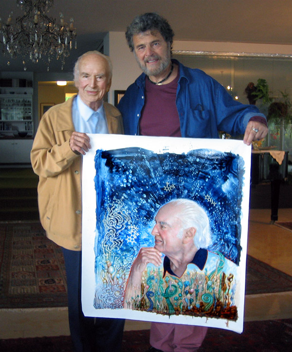 Scientist Albert Hoffman with artist Bob Venosa and his portrait of Hoffman.
