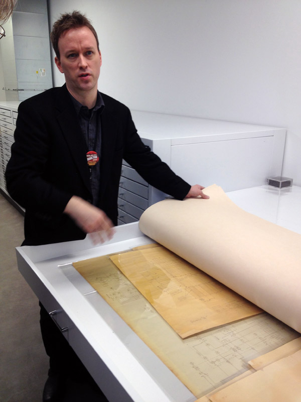 Library and Archives director Andy Leach showing the original architectural plans for Gold Star Studios where Phil Spector created the “Wall of Sound”. Copyright ©Carlotta Hester. All Rights Reserved.