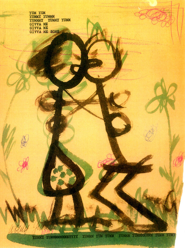 Finally, the drawing Leitch was looking for surfaced from the stack. “It sounds like a children’s lyric,” he said, examining the lines typed in all caps above two canoodling stick figures. “A loving lyric.”
