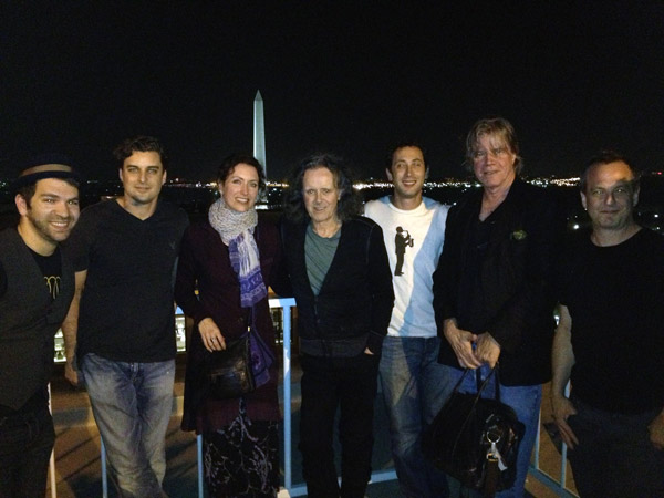 Donovan on the roof of the Hamilton with his band and friends: Hamilton sound and lighting technician Daniel Schwartz, bassist Brian Fishler, artist Carlotta Hester, Donovan, musical director Mitch Marcus, Govinda Gallery director Chris Murray, and drummer Dave Dreiwitz. Copyright © Govinda Gallery Archive. All Rights Reserved.