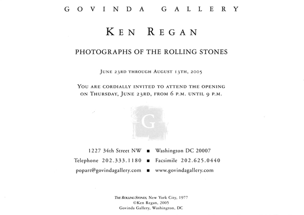 That same year Govinda Gallery presented Ken’s second exhibition; Ken Regan: Photographs of the Rolling Stones, with an opening reception on June 23rd, 2005. The Stones tour A Bigger Bang was underway. It was the only time that Govinda Gallery presented two exhibitions by the same artist in the same year.
