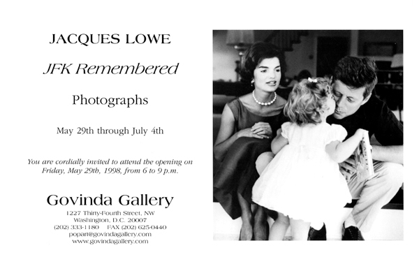 It was fifteen years ago this spring that Govinda Gallery presented J.F.K. Remembered, exhibiting for the first time the Kennedy photographs of Jacques Lowe. The exhibition was a remarkable one and featured photos of President Kennedy and his family. Former Kennedy Press Secretary Pierre Salinger attended the opening that evening and put his unforgettable voice on Govinda’s answering machine announcing the exhibition for the duration of the show. Jacques Lowe attended the opening at Govinda with his daughter Victoria Allen and everyone had a great time.