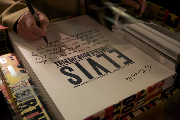 Editor Chris Murray signing Priscilla Presley’s copy of Elvis and the Birth of Rock and Roll. Copyright © Dalmiro Quiroga. All Rights Reserved.