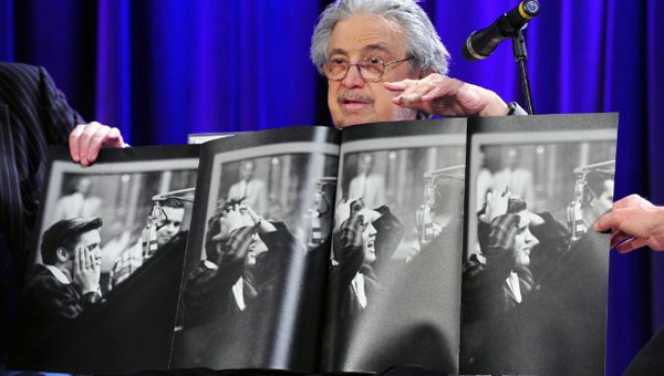 Alfred Wertheimer showing the Grammy Museum audience a black and white spread of Elvis recording in 1956 from Elvis and the Birth of Rock and Roll. Copyright © Mark Sullivan. All Rights Reserved.