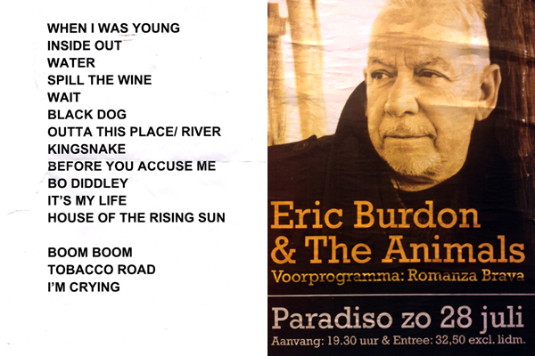 Eric Burdon’s set list and the poster for his show.