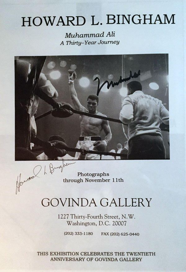 When I first met Howard Bingham, I asked him if he would help me celebrate Govinda Gallery’s 20th anniversary with an exhibition of his photographs of Muhammad Ali. He did, and here is a full-page ad for that exhibition in the Washington Review of the Arts. I had Muhammad and Howard sign that full-page for me. When I first showed the ad to Howard Bingham, he was with Ali and he jokingly pointed out to Ali how his name was the big name and Ali’s was smaller. He told Ali with a sly smile and Muhammad pretended he was angry! It was really funny and a great moment between two great friends. I miss them both, but their mutual legacy goes on forever. For me Howard’s passing and Ali’s passing this year mark the end of the Ali era.