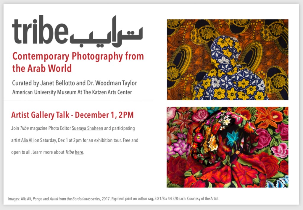 In 2015, Sueraya Shaheen co-founded Tribe with publisher Mubarik Jafery, the first fine art magazine to feature contemporary photography from the Arab World. Shaheen has now organized a sensational exhibition of photographs featured in Tribe at the American University Museum at the Katzen Arts Center. Tomorrow, Shaheen will be giving a tour of the exhibition with photographer Alia Ali. The tour is free and open to the public.