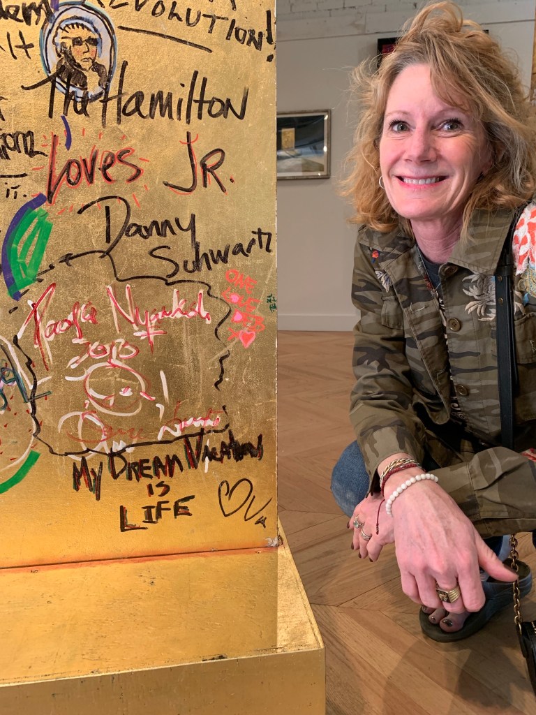 Govinda Gallery artist Carlotta Hester marking the Montserrat House door. Photo by Chris Murray.