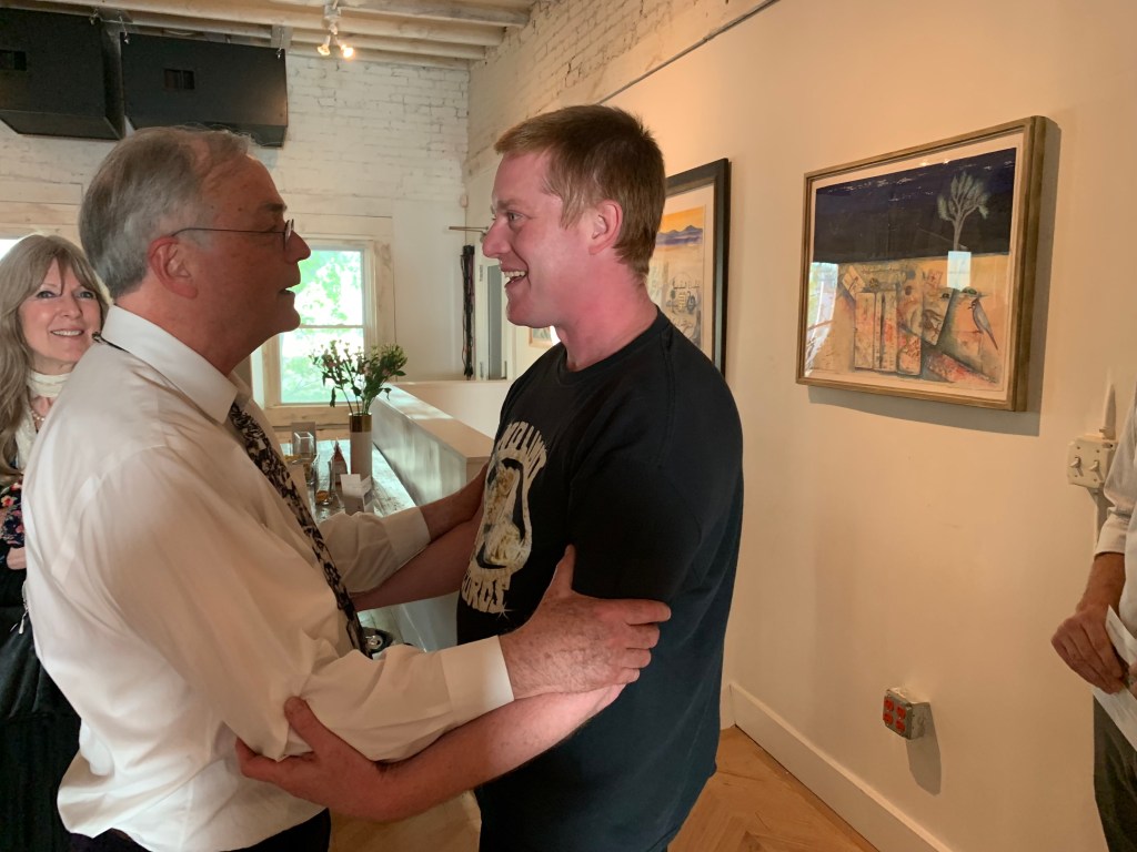 Bill Adair greeting Govinda Gallery’s David Murray at the exhibition. Photo by Carlotta Hester.
