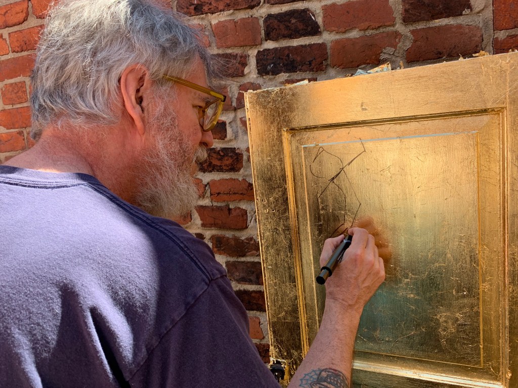 Artist Tom Meyer marking the “Montserrat House Door.” Photo by Carlotta Hester.