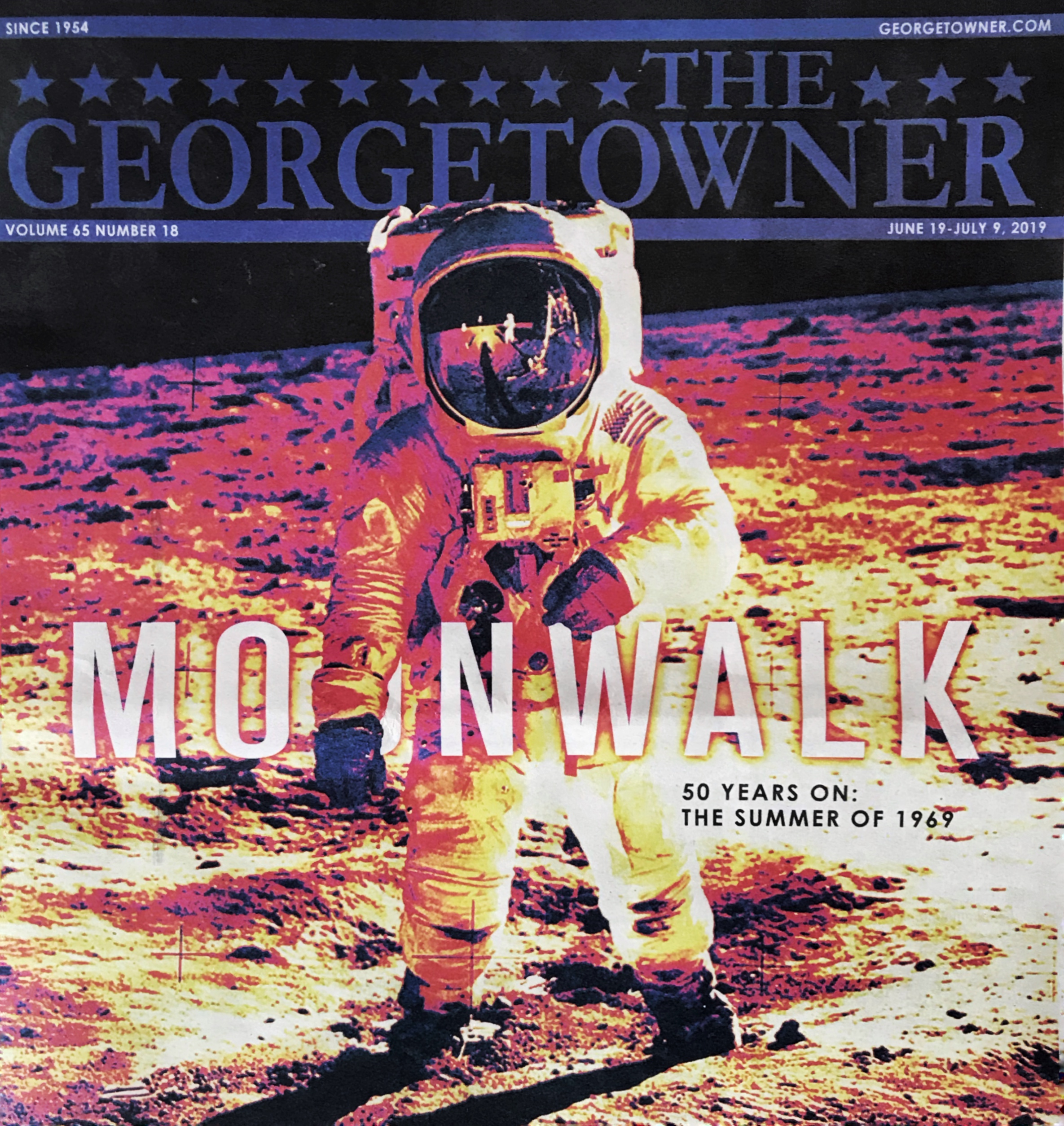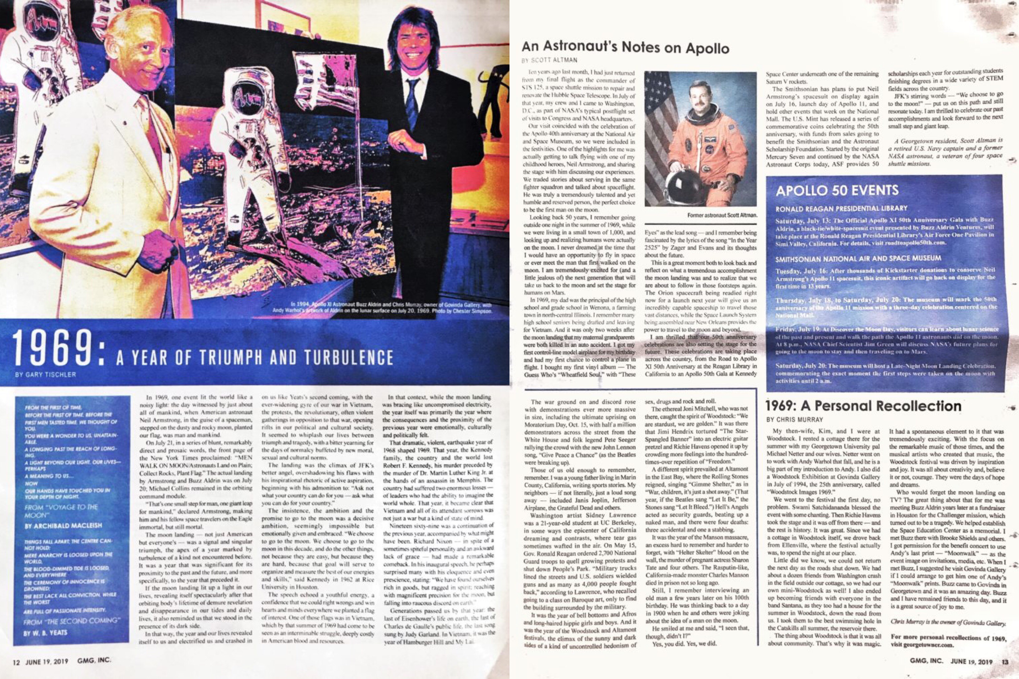 Cover of June 2019’s Georgetowner, featuring a photograph of astronaut Buzz Aldrin, taken by the Apollo 11 mission commander, Neil Armstrong. The June 2019 Georgetowner’s center spread, featuring a photograph of Chris Murray and Buzz Aldrin with Andy Warhol’s Moonwalk, as well as Chris Murray’s “Personal Recollection” on the following page. Photo of Chris and Buzz taken by Chester Simpson.