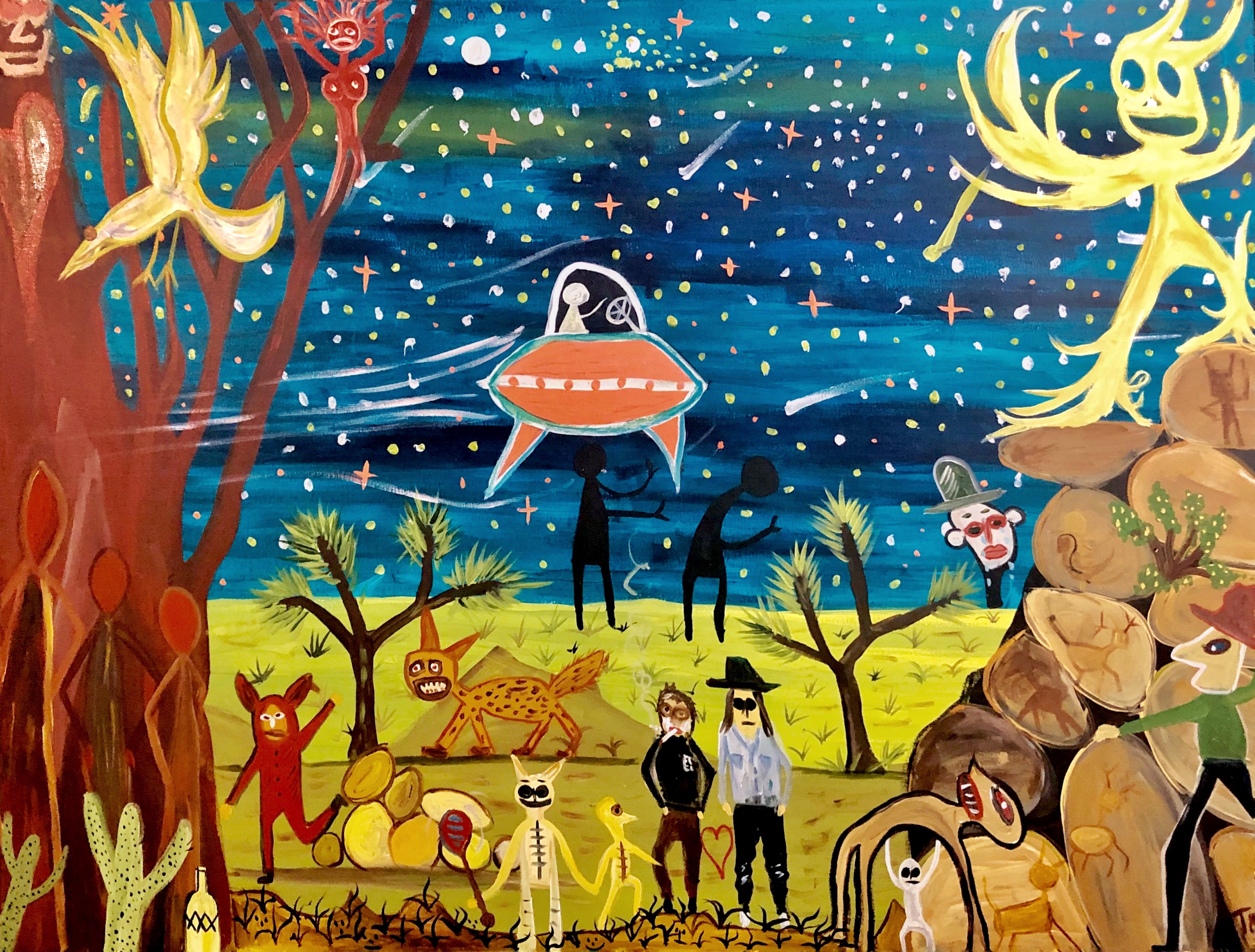 If you guessed the center image you are correct. All of the others are details from the visionary/outlier artist Tom Meyer’s paintings. Below is the latest painting from Meyer’s studio. I enjoy how the stones that seem to form a cave in the lower right corner have ‘cave paintings’ on them.