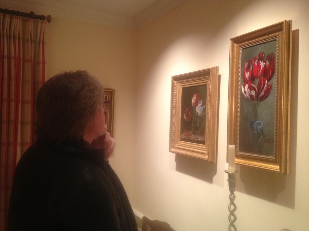 Govinda Gallery Director Chris Murray enjoying paintings by John Warner at his home. Photo by Carlotta Hester.