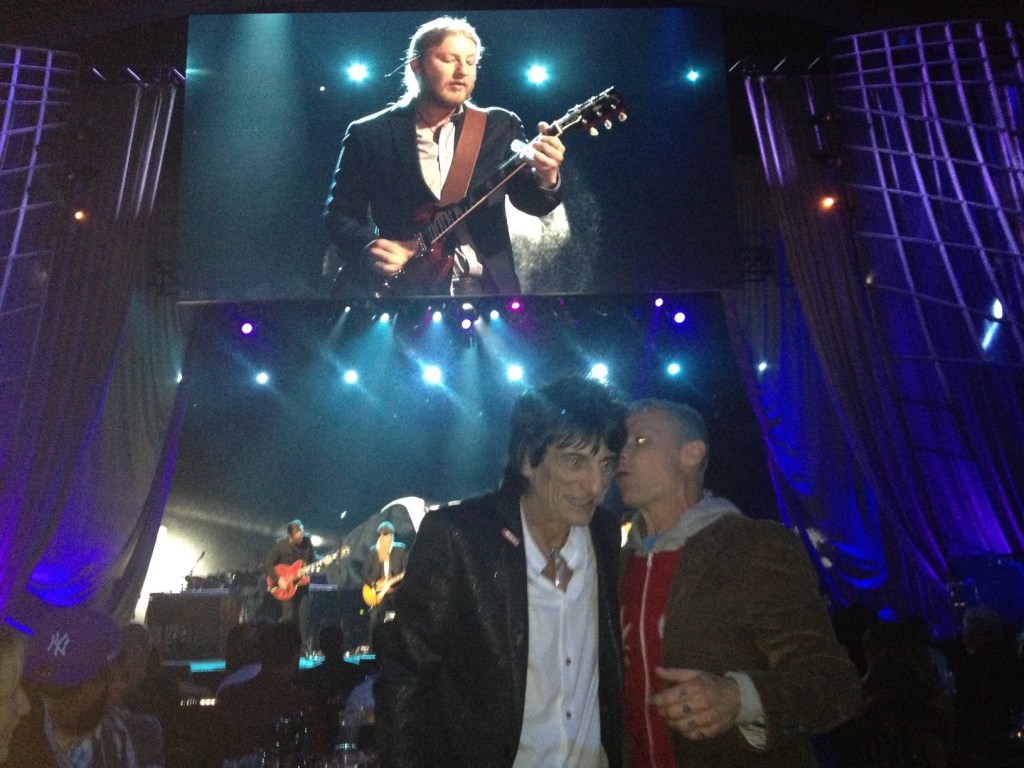 Derek Trucks on the ‘big screen’ as the Freddie King tribute band performs, while Ronnie Wood and Flea confer.