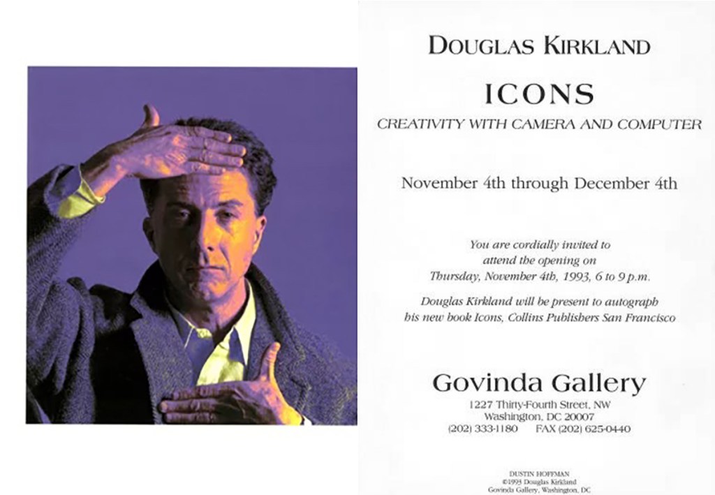 It was my great honor to host Kirkland’s first two exhibitions at Govinda Gallery, Light Years in the spring of 1990 and Icons in the fall of 1993. Light Years launched Kirkland’s book of the same name and that exhibition featured portraits of Dustin Hoffman, Ann Margaret, Catherine Deneuve, Marilyn Monroe, Elizabeth Taylor, and many more.