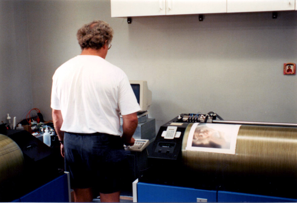 Jack Duganne operating the printer at Nash Editions, 1992.