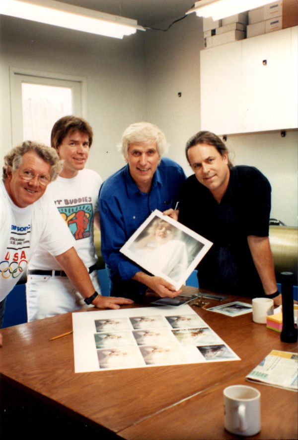 Jack Duganne, Chris Murray, Douglas Kirkland, and Mac Holbert at Nash Editions with Marilyn Monroe proofs, Manhattan Beach, California, 1992.