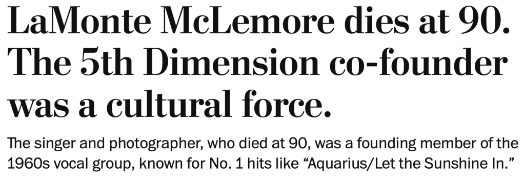 Mr. McLemore, who died Feb. 3 at age 90, was best known as a founding member of the 5th Dimension, the genre-blending vocal group behind cheery, chart-topping hits like 1969’s “Aquarius/Let the Sunshine In,” a medley from the rock musical “Hair.” In an era of political violence and racial unrest, he and his fellow singers honed a fizzy style they called “champagne soul,” reaching a post-hippie audience — “This is the dawning of the Age of Aquarius,” they sang — while fusing jazz, pop and R&B.